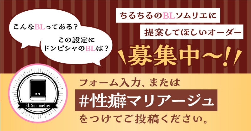 「受けが触手でめちゃくちゃにされる作品が知りたい」こんな癖(ヘキ)や、「ピュアな学生の作品が読みたい」など、探してほしいBLやお悩みを、ぜひお聞かせください!