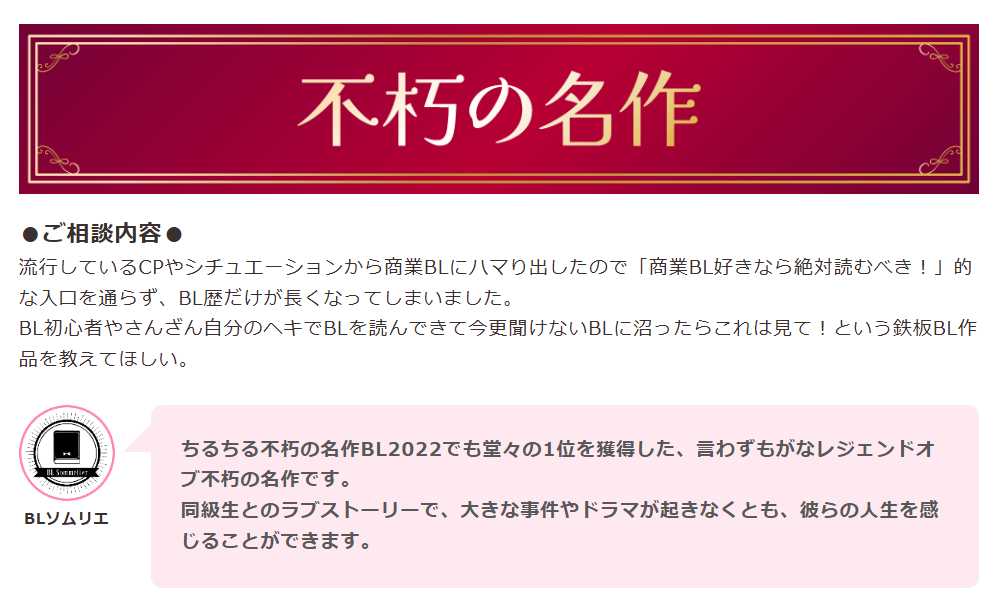 ご相談内容、BLソムリエのオススメポイント、作品を読んだスタッフレビューも見逃せません。