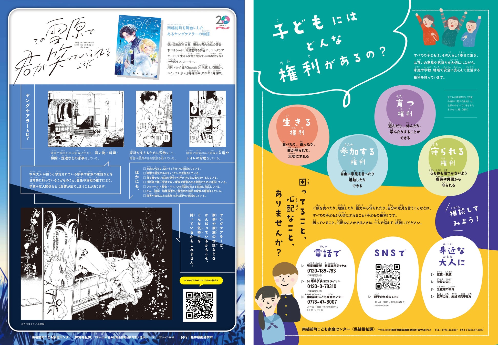 またヤングケアラー問題啓蒙パンフレットは、福井県社会福祉協議会事務所でもポスターサイズで掲出をされます。福井県はヤングケアラー支援事業の一環として、こども・若者が自由に過ごすことができるサポートセンターや、オンラインサロンを開設。サポートセンターへの交通費の全額補助、オンライン機器の貸し出しなどを行っています。今回の南越前町の取り組みに関して、「マンガ作品を通じてヤングケアラー問題を紹介することで、当事者である若者世代に知識を深めてもらうきっかけになれば」と福井県社会福祉協議会をはじめ関係者から期待が寄せられています。