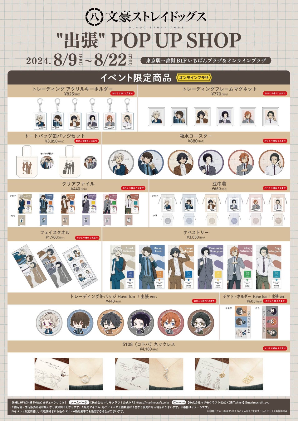 株式会社マリモクラフト(本社:東京都江東区)は、東京駅一番街 東京キャラクターストリート「いちばんプラザ」にて、TVアニメ『文豪ストレイドッグス』の描き下ろしイラストを使用したPOP UP SHOPを2024年8月9日(金)から8月22日(木)までの期間限定でオープンします。