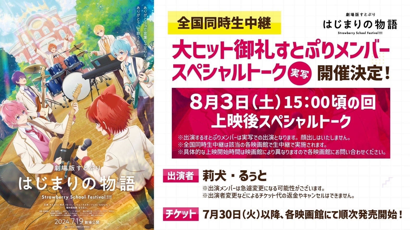 2024年7月19日(金)より公開いたしました『劇場版すとぷり はじまりの物語~Strawberry School Festival!!!~』は、全国生中継 大ヒット御礼すとぷりメンバースペシャルトーク(実写)の開催を決定しました!
