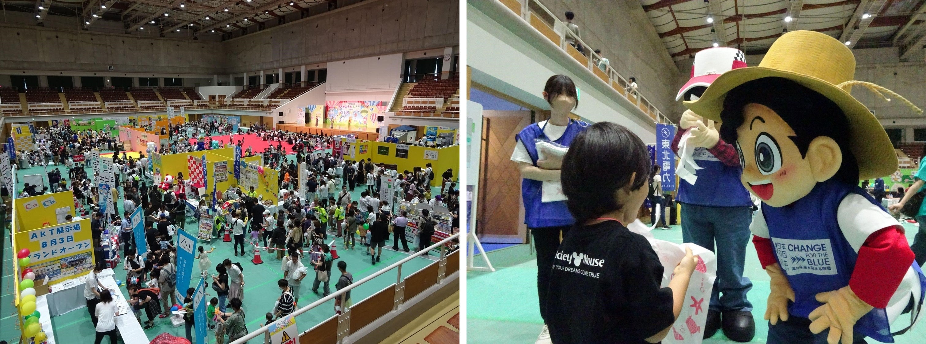 あきた海ごみゼロプロジェクト実行委員会は、2日目の7月28日(日)に、釣りキチ三平ごみ拾い隊の顔である三平くんと、今年新たに加わった魚紳くんと共にイベントに参加し、訪れる方々にごみの分別やポイ捨て禁止を啓発するチラシや、CHANGE FOR THE BLUEオリジナルごみ袋の配布を行いました。