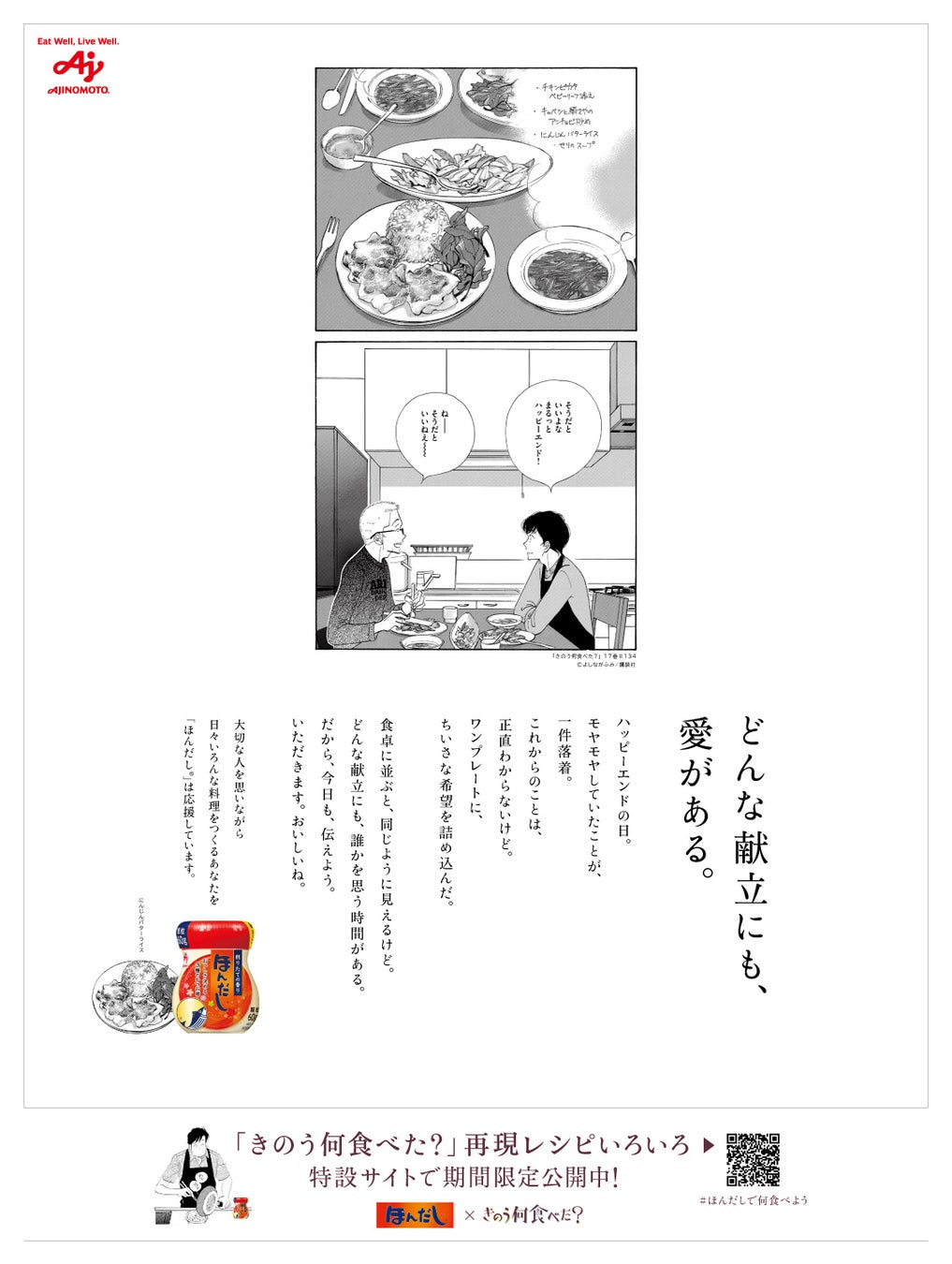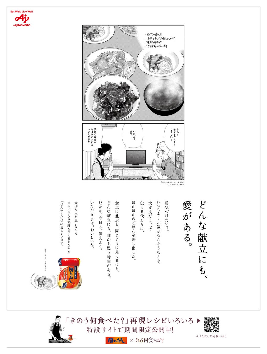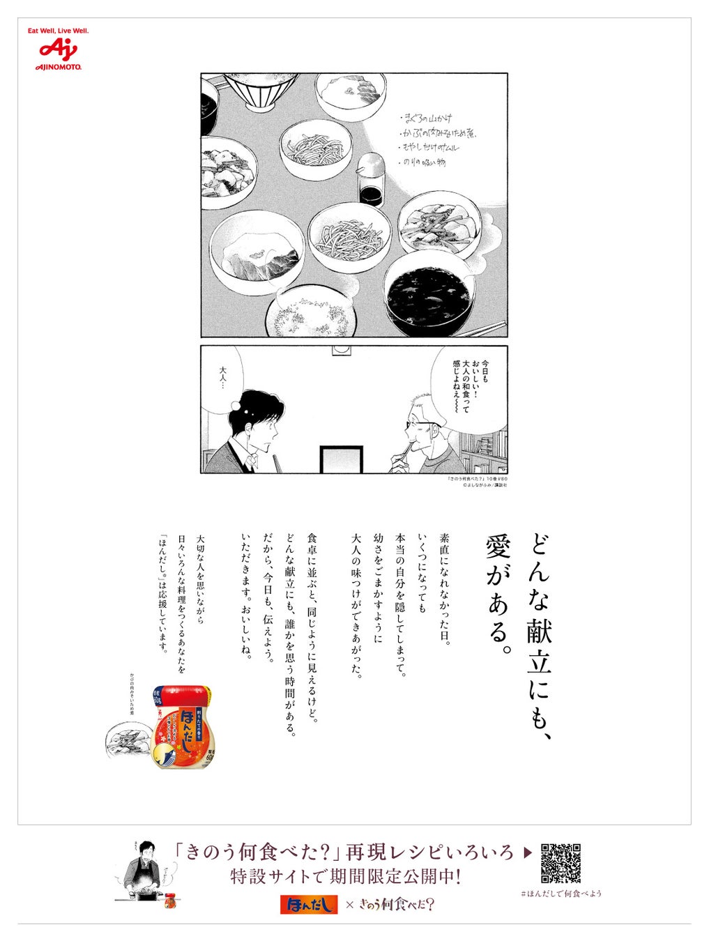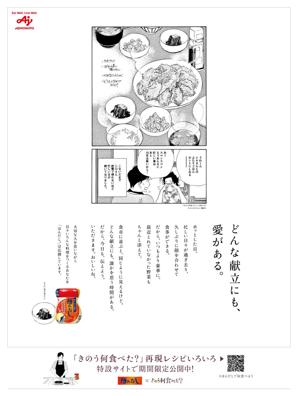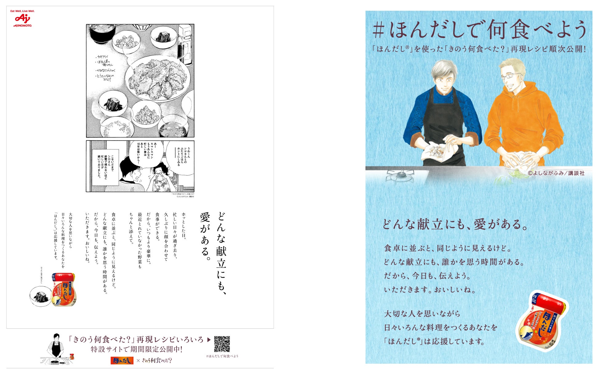 味の素株式会社(社長:藤江 太郎、本社:東京都中央区)は、当社の和風だしの素「ほんだし®」の、 “和風だしで毎日の食卓に安らぎやよろこびをもたらしたい、料理をつくる人を応援したい”というブランドコンセプトと、よしながふみ先生の人気漫画『きのう何食べた?』(講談社刊)で描かれている、“料理は、大切な人を思う時間”というメッセージを重ね、同作品とのコラボによる“どんな献立にも、愛がある。”をテーマとした企画を2024年8月1日(木)より開始します。