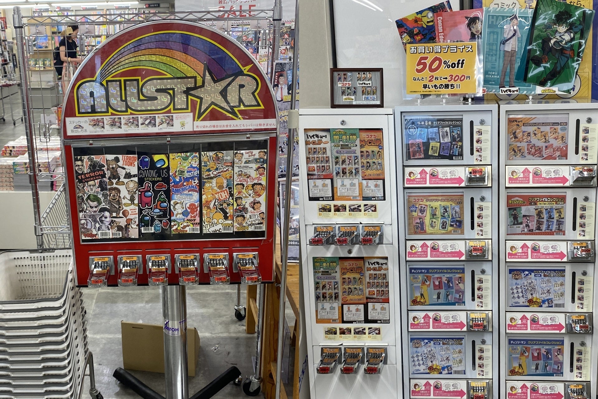 今回の企画は、AMNと斎藤企画の業務提携(2024年3月18日発表)に基づくもので、書籍・文具・レンタルDVD利用客で賑わう店内のスペースに、以下のアニメグッズ自販機を設置しました。
