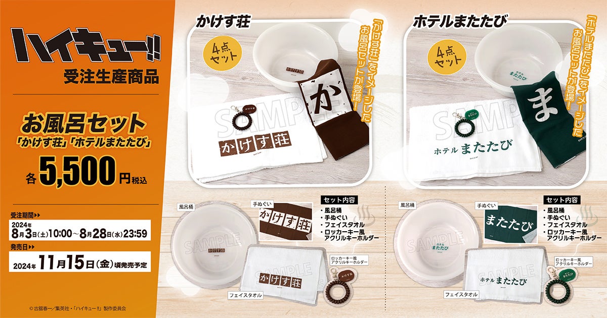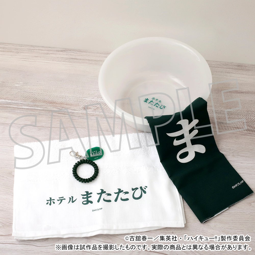 作中に登場したかけす荘とホテルまたたびをイメージした「お風呂セット」が登場!風呂桶・手ぬぐい・ロッカーキー風アクリルキーホルダー・フェイスタオルの豪華4点セット!お風呂グッズとしてはもちろん、お手持ちのグッズと一緒に飾ってもおたのしみいただけます。