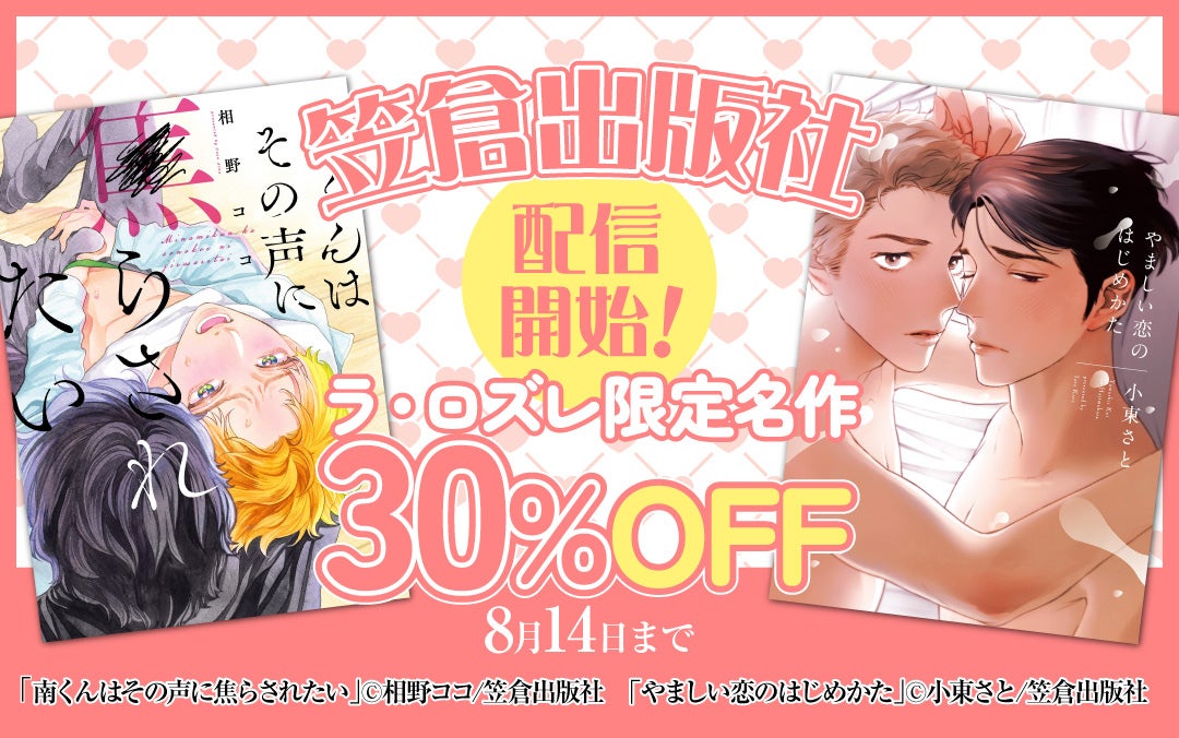 La Roseraie(ラ・ロズレ)では、配信を記念して、笠倉出版社の名作BLが30%オフで楽しめるキャンペーンを開催しております!