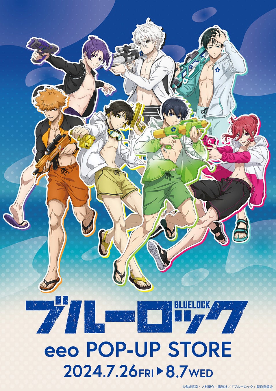 今回の新作グッズには「水着」をテーマに描き下ろされた新規イラストを使用。潔 世一たち7人の爽快感溢れるイラストは、暑い夏に涼しさを与えてくれます! また、POP-UP STOREでは描き下ろしイラストを使用したキャラクターパネルの展示も!!