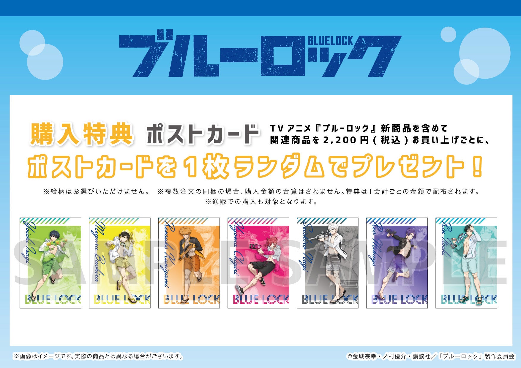 TVアニメ『ブルーロック』の新商品を含めて2,200円(税込)お買い上げごとに、ポストカード(全7種)をランダムで1枚、プレゼントします!