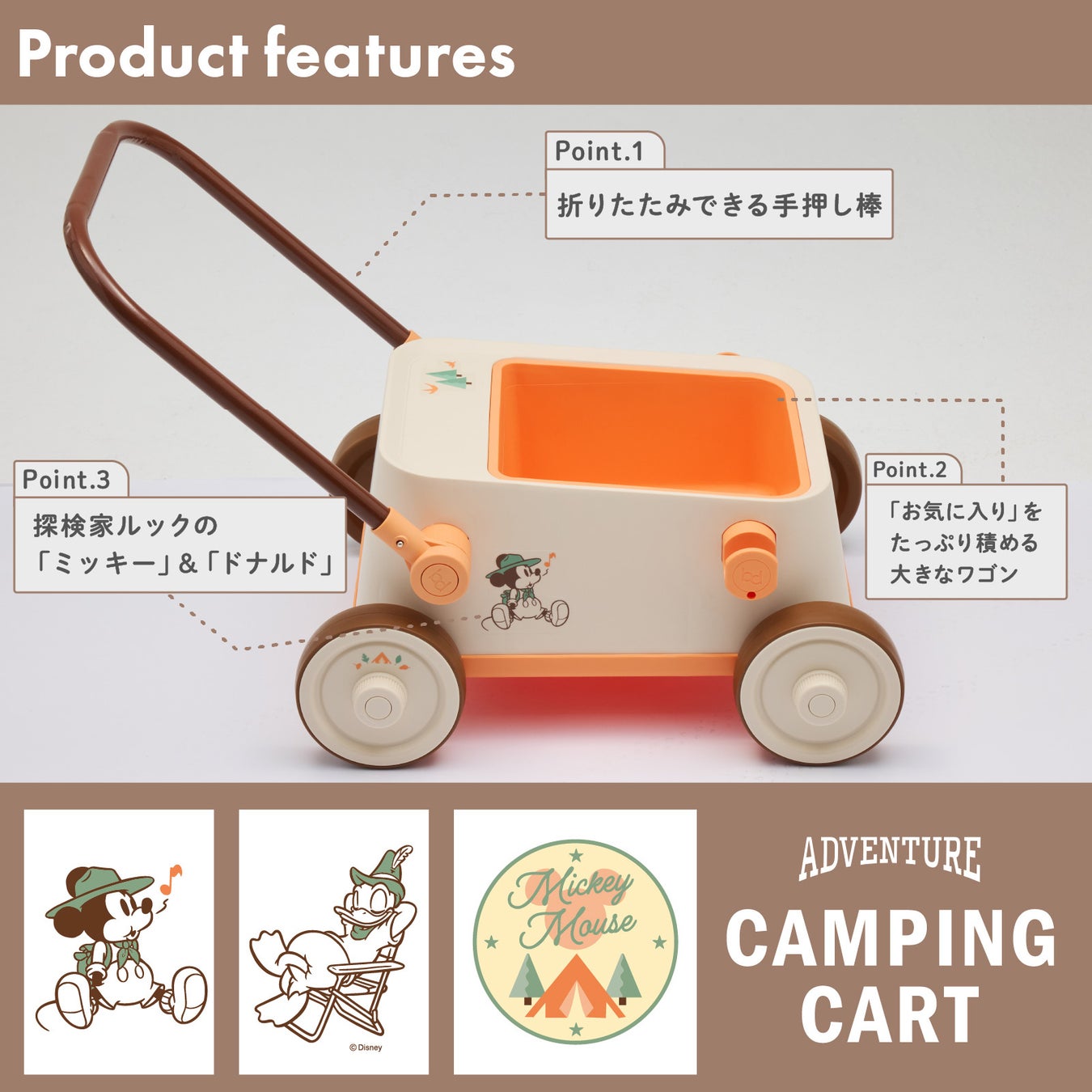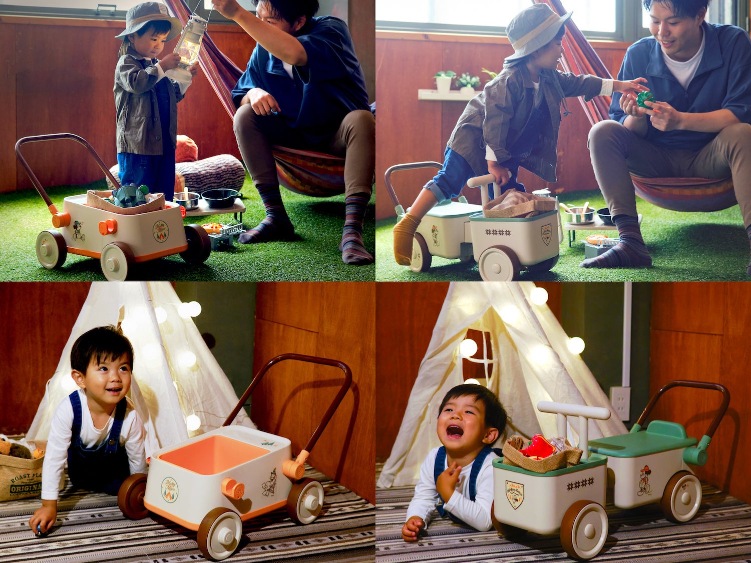 手押しのワゴンタイプ。広々としたワゴンにお菓子やおもちゃをたっぷり積み込んで、おうちキャンプの準備をお手伝い。