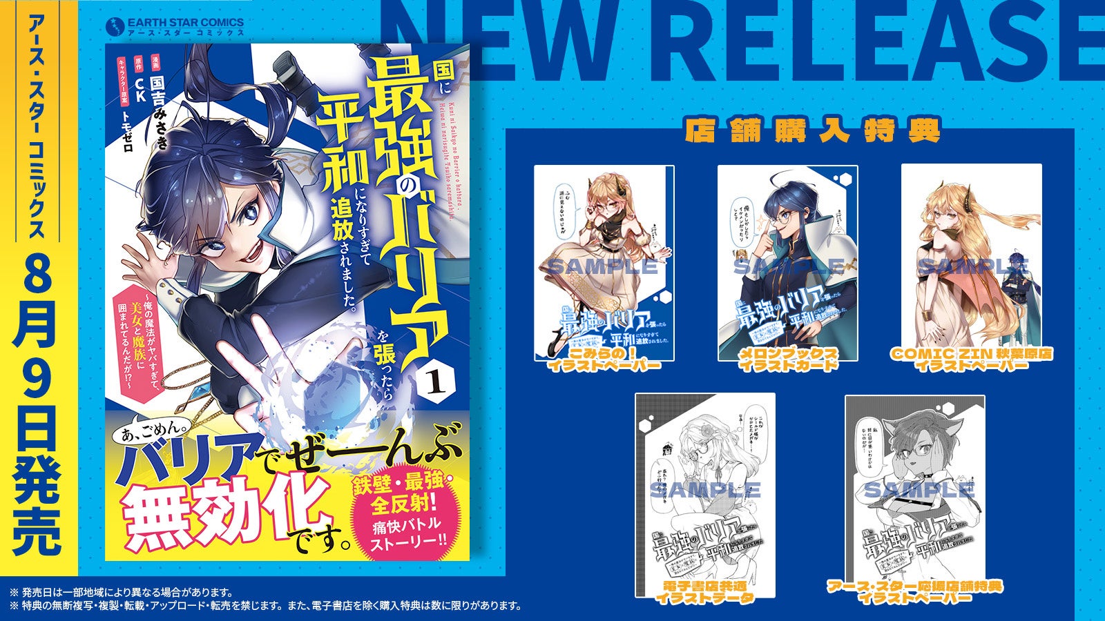 現在コミック アース・スター公式サイトにて連載中の人気作品『国に最強のバリアを張ったら平和になりすぎて追放されました。~俺の魔法がヤバすぎて、美女と魔族に囲まれてるんだが!?~』第1巻(漫画:国吉みさき 原作:CK キャラクター原案:トモゼロ)を8月9日(金)に発売いたします。