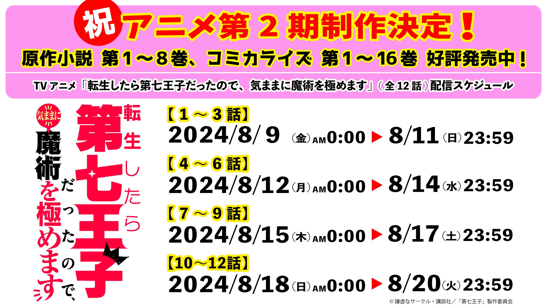 TVアニメ「転生したら第七王子だったので、気ままに魔術を極めます」が、2024年4月からテレ東系列ほかにて放送され、6月末に最終回を迎えました。そしてアニメ第2期の制作決定が発表…‼これを記念しまして、講談社が運営するYouTubeチャンネル「フル☆アニメTV」にて、TVアニメ「転生したら第七王子だったので、気ままに魔術を極めます」全12話を期間限定で順次無料配信いたします。【第1話~第3話】を本日8月9日から8月11日まで、【第4話~第6話】を8月12日から8月14日まで、【第7話~第9話】を8月15日から8月17日まで、【第10話~第12話】を8月18日から8月20日までの期間限定配信となりますので、ぜひお楽しみください!