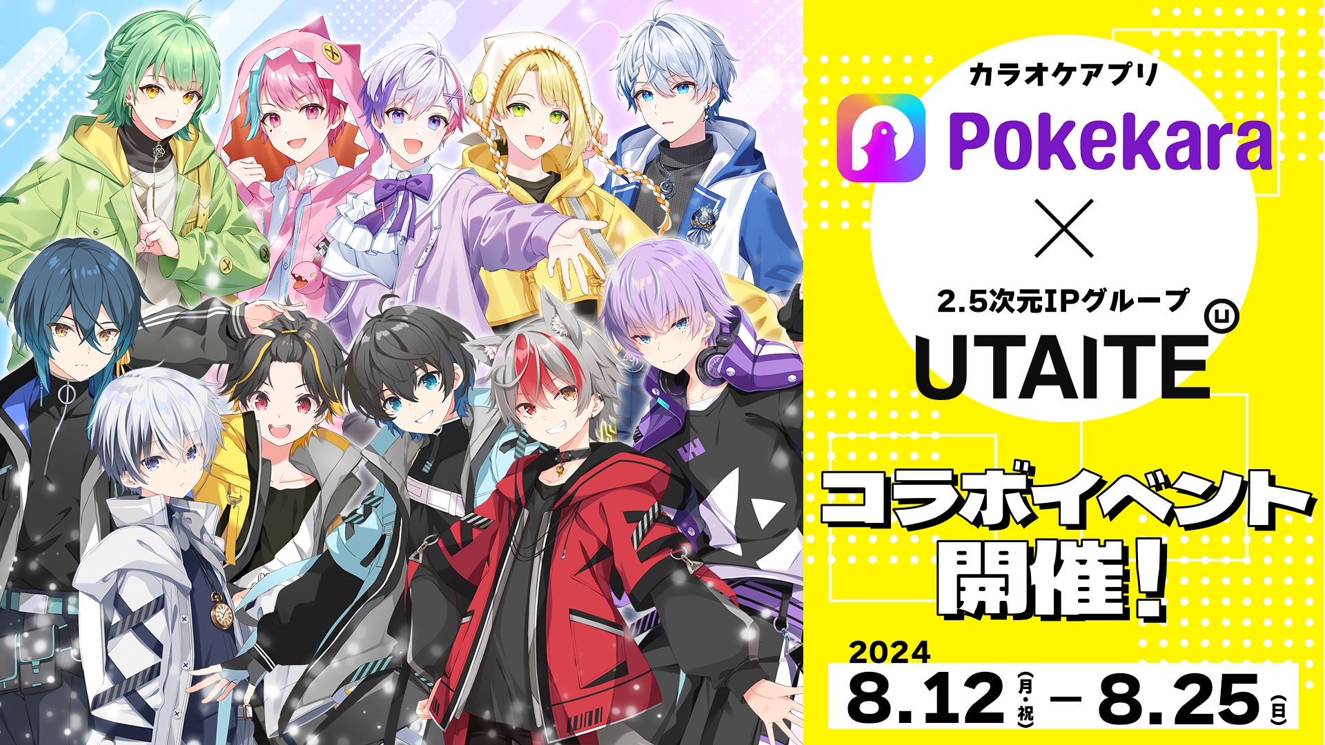 2.5次元IP開発、運営を行う株式会社ウタイテ(本社:東京都新宿区、代表取締役:倉田将志)は、2024年8月12日(月)〜25日(日)の期間、株式会社音娯時間エンターテインメントのカラオケアプリ『Pokekara』とのコラボイベントを開催することをお知らせいたします。