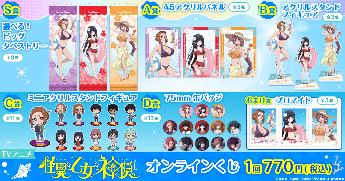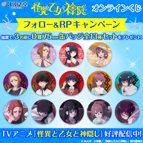 <TVアニメ 怪異と乙女と神隠し オンラインくじ 概要> 販売期間:2024年8月20日(火)12:00~2024年9月17日(火)11:59 販売価格:1回 770円(税込)※別途発送手数料が掛かります。 |