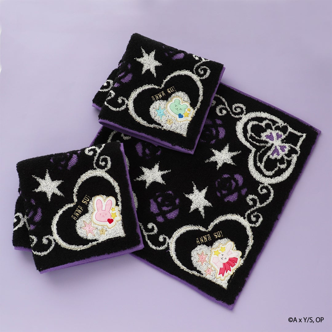 ANNA SUIらしい薔薇とバタフライのモチーフに星を組み合わせたシリーズです。右下のアップリケは作中に登場するアイコンをモチーフにしたファン必見のデザインです。