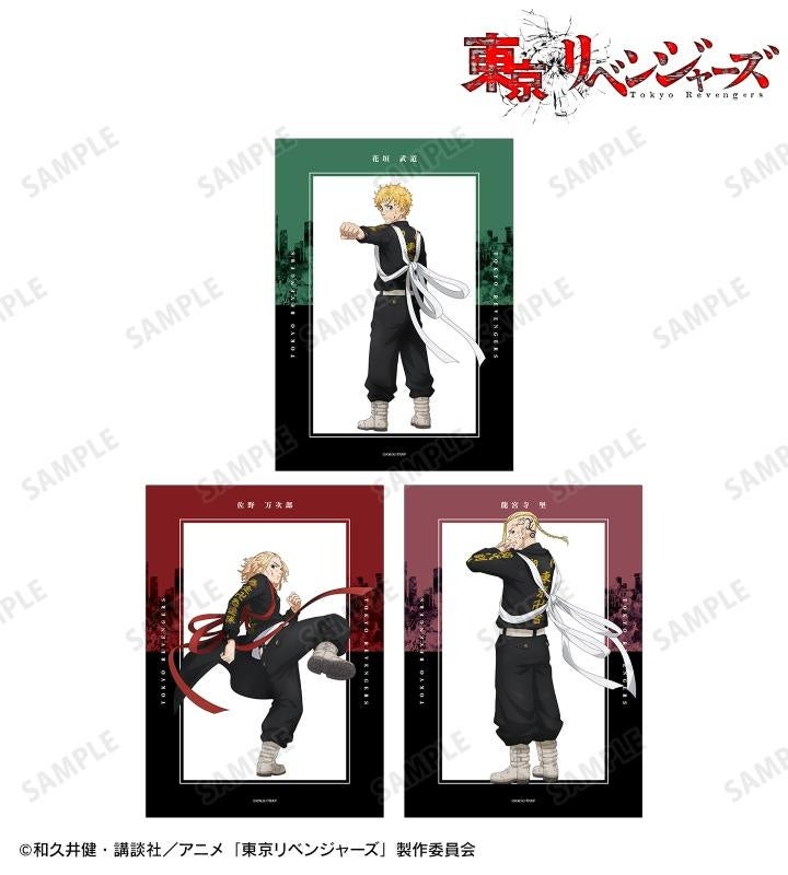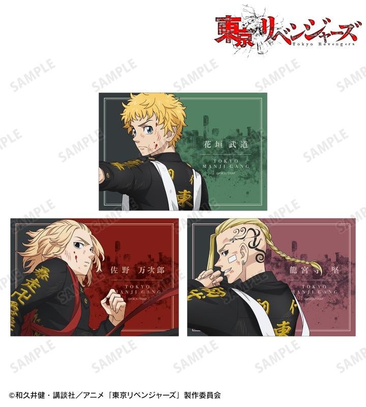 花垣 武道、佐野 万次郎、龍宮寺 堅、松野 千冬、三ツ谷 隆、河田 ナホヤ、乾 青宗、九井 一の描き下ろしイラストをブロマイド3枚セットに仕上げました。