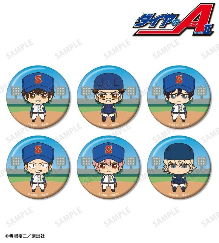 沢村栄純、御幸一也、降谷暁、倉持洋一、小湊春市、奥村光舟がちょこんと立っているちびキャラを新たに描き起こし、缶バッジに仕上げました。
