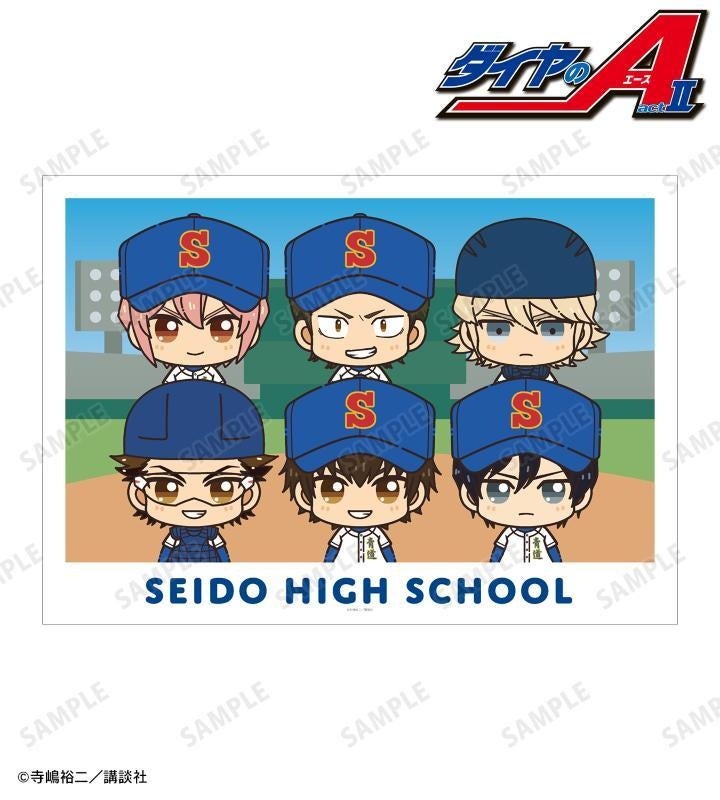 沢村栄純、御幸一也、降谷暁、倉持洋一、小湊春市、奥村光舟がちょこんと立っているちびキャラを新たに描き起こし、A3サイズのマット加工されたポスターに仕上げました。