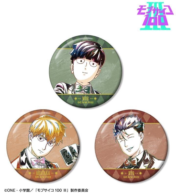 描き下ろしイラストの影山茂夫、霊幻新隆、島崎亮を新たなタッチで魅力的に表現し、キャラクターカラーに合わせた缶バッジ3個セットに仕上げました。