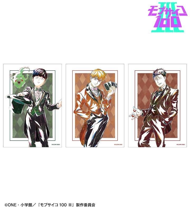 描き下ろしイラストの影山茂夫、霊幻新隆、島崎亮を新たなタッチで魅力的に表現し、キャラクターカラーに合わせたブロマイド3枚セットに仕上げました。