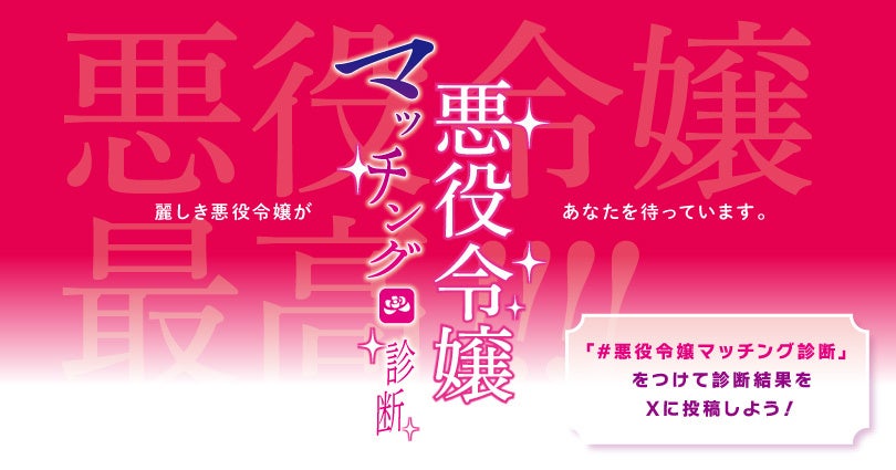 本診断テストは、「今日は待ちに待った婚約者の王子とのデートの日。…だったはずなのに、王子の隣には平民出身のあの忌々しいヒロインが! さあ、あなたならどうする?」など、ユーザーがどう行動するかを診断し、あなたにピッタリの悪役令嬢作品をご提案するものです。