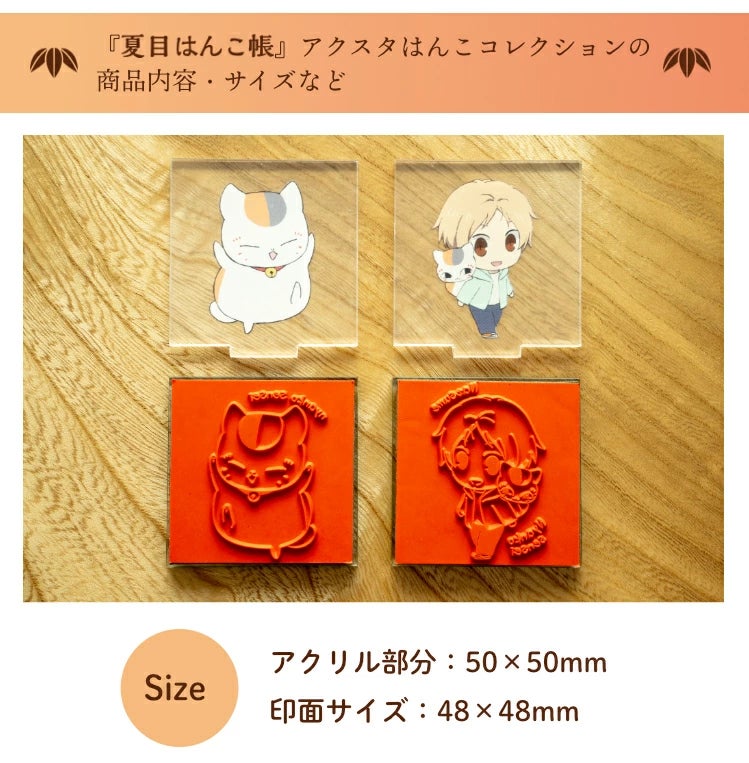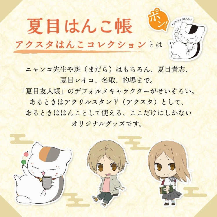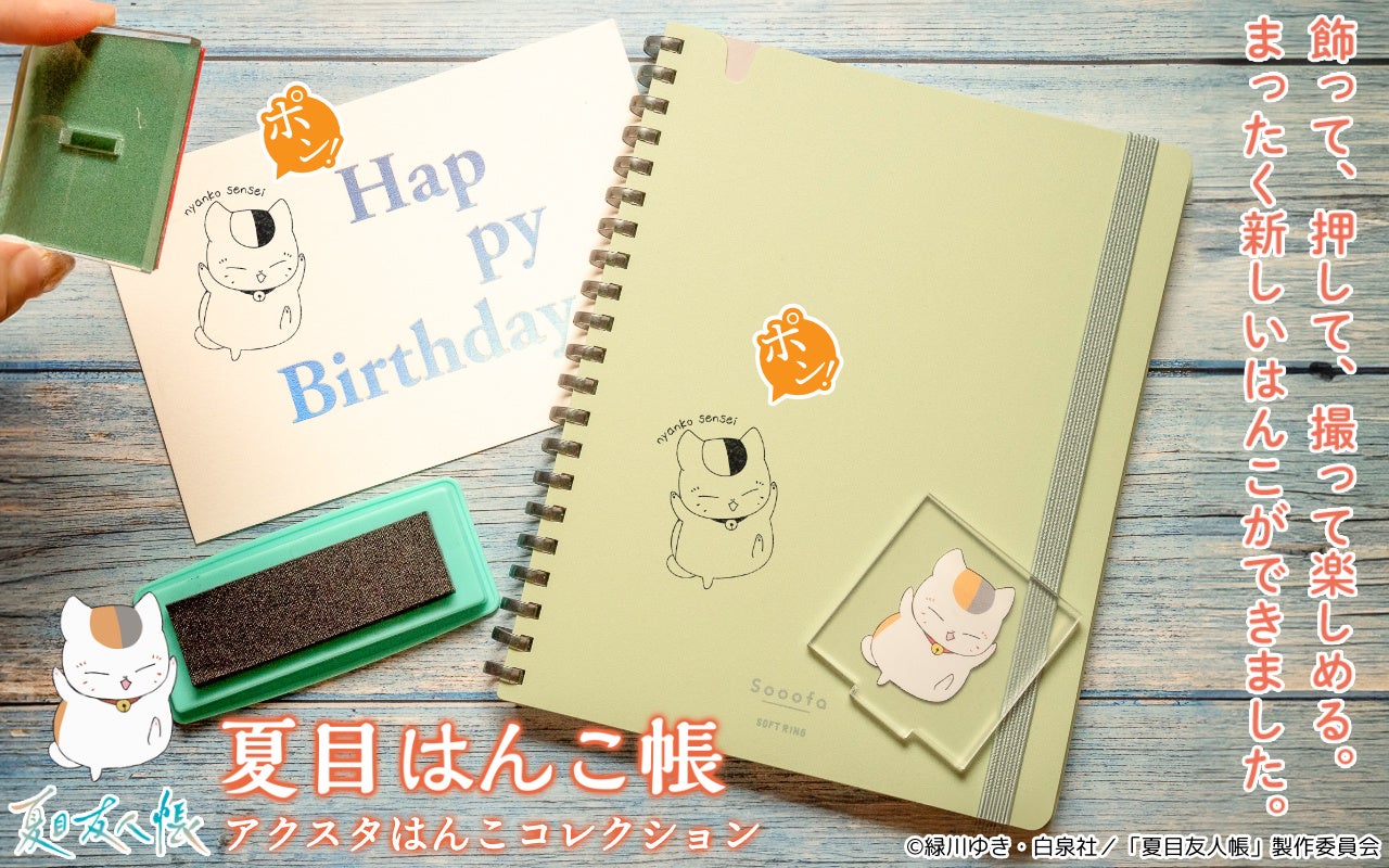 沢山のファンに愛され、今年の10月からアニメ第7期もスタートする「夏目友人帳」。「夏目はんこ帳 アクスタはんこコレクション」は、おうちや会社のデスクに飾ることはもちろん、外出先へ持ち歩いて写真に収めたりと、ファングッズとして人気の高いアクリルスタンド(アクスタ)と、スケジュール帳やノートのデコレーション、手紙や封筒、手作りカードなどに押して楽しめるスタンプが一体となった新感覚のグッズです。