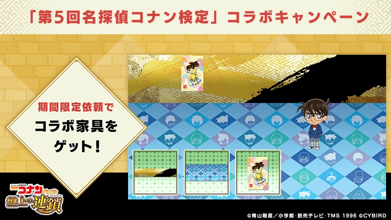 『名探偵コナンパズル 盤上の連鎖(クロスチェイン)』の期間限定の[依頼]として、『名探偵コナンパズル 盤上の連鎖(クロスチェイン)』をプレイしている全てのお客様を対象とし、無償で「第5回名探偵コナン検定」コラボ家具をプレゼントします。