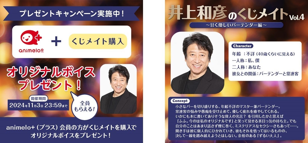 「井上和彦のくじメイトVol.4~甘く優しいバーテンダー編~」は、今年で活動50周年を迎える声優・井上和彦の第4回目となるオンラインくじです。
