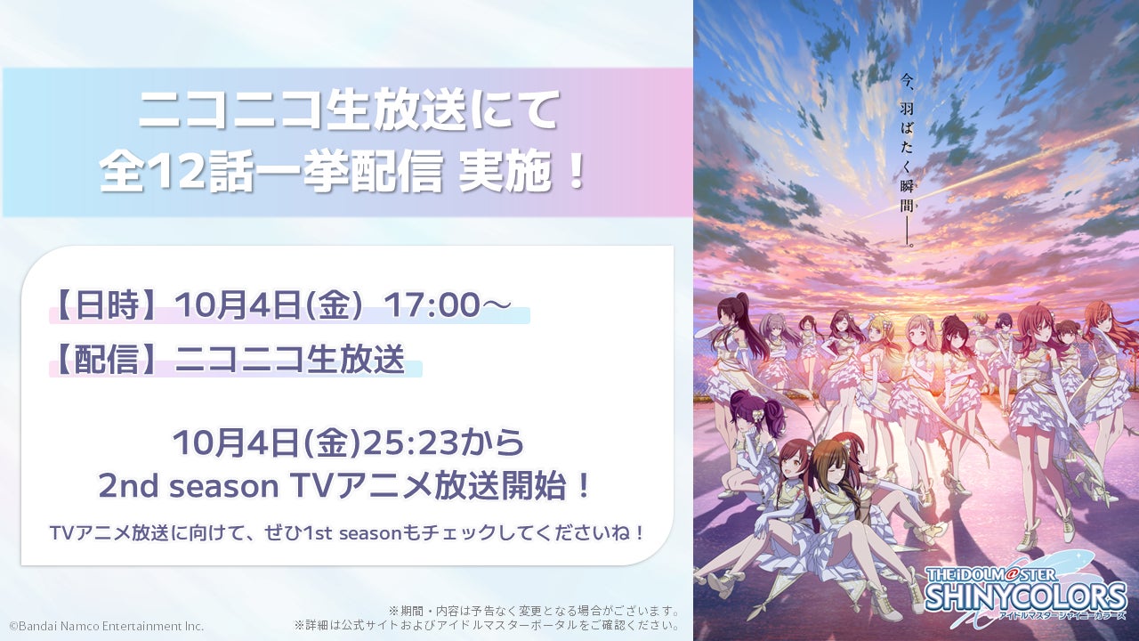 アニメ「アイドルマスター シャイニーカラーズ 2nd season」が10月4日(金)25:23からTVアニメ放送開始することを記念して、前作となるシャニアニの全12話一挙配信を実施します!