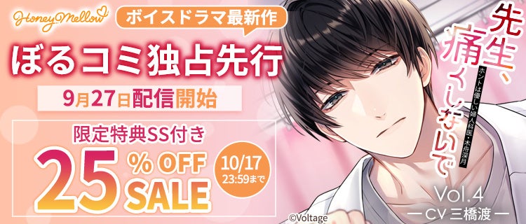 「Honey Mellow」の人気シリーズ「先生、痛くしないで Vol.4 ~ホントは優しい婦人科医・木舟深月~」 (CV.三橋渡) のダウンロード先行配信をぼるコミにて9月27日(金)より開始したことをお知らせいたします。