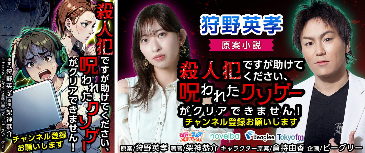 『まんが王国 presents 世界はまんがで出来ている!』は、スマホで読めるマンガをはじめ様々なジャンルの作品をピックアップし、リスナーと一緒に漫画愛を語り合う、トーク番組。番組内企画、「狩野英孝!倉持由香!まんが制作プロジェクト!」は、パーソナリティの狩野英孝が放送中に「番組オリジナルのマンガを作ってみたい!」という発言をしたことをきっかけに、ストーリー原案・狩野英孝、キャラクター原案・倉持由香のまんが制作企画がスタート。その第1弾として、狩野が原案を、作家の架神恭介が原作を務めた小説版「殺人犯ですが助けてください、呪われたクソゲーがクリアできません!チャンネル登録お願いします」が小説投稿サービス『ノベルバ』(https://novelba.com/)にて連載を開始しました。作品は狩野の好きなジャンルであるミステリー。9月28日(土)19時からの放送では、架神恭介先生をゲストに迎えこの作品の読みどころを語ります。どうぞお楽しみに!