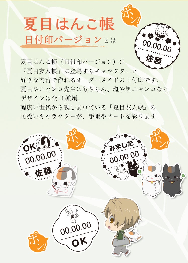 インターネットのはんこ屋さん「印鑑はんこSHOPハンコズ」を運営する株式会社岡田商会(所在地:大阪府大阪市、店長:岡山耕二郎)は自社オンラインショップにて、ポン!と押すたびにアニメ「夏目友人帳」のキャラクタ―がかわいく日付を教えてくれる「夏目はんこ帳 日付印バージョン」の発売を開始いたしました。