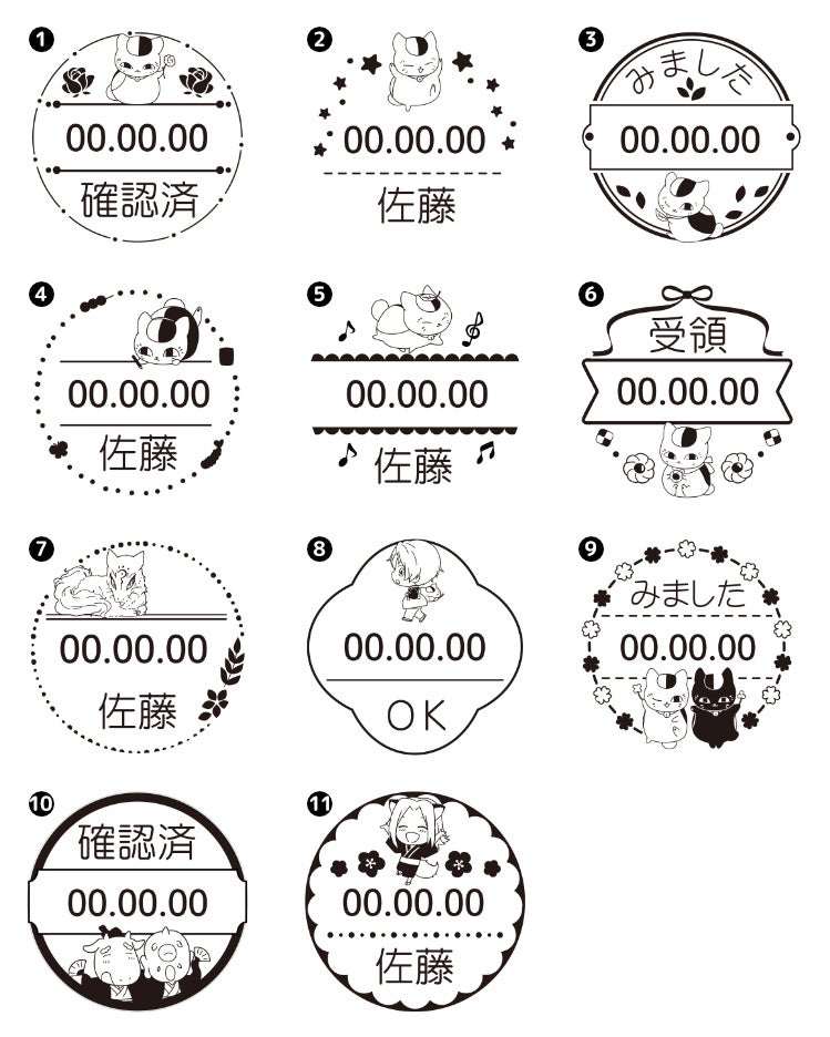 日付印のデザインはこちらの11種類。夏目と一緒のニャンコ先生や、嬉しそうに飛び跳ねているニャンコ先生、お花を持って澄ましているニャンコ先生、黒ニャンコとペアのニャンコ先生、ニャンコ先生の本来の姿である斑(まだら)、中級妖怪や子狐たちが押すたびに日付を知らせながら、ほっこりと癒してくれます。