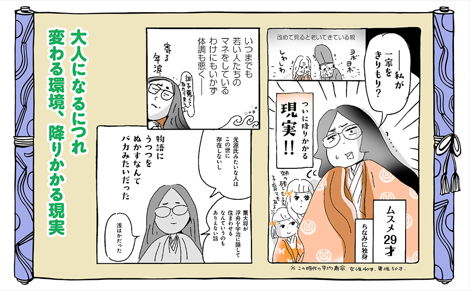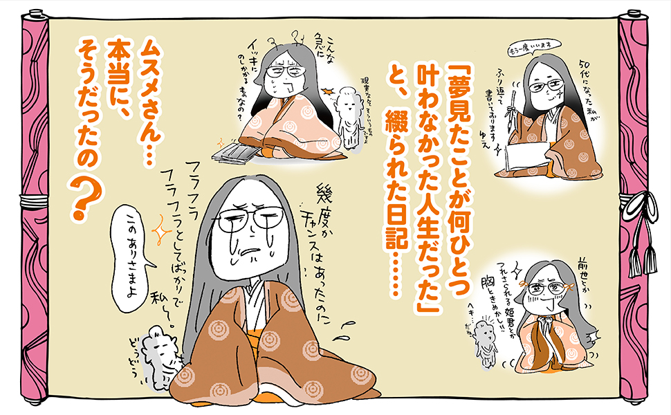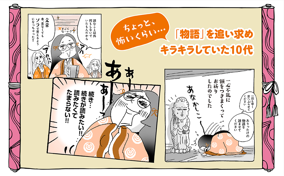 10代のムスメ(本書では、菅原孝標女(すがわらのたかすえのむすめ)を敬意と愛情をこめて「ムスメ」と名付けました)は、とにかく物語ファーストの文学少女。『源氏物語』を全巻読むために、等身大の仏像まで彫らせて、毎日一心不乱にお祈りをするほど。やっとの思いで全巻を手に入れたムスメは、「ひたすら読み続けているときの心地は、お后(おきさき)になるよりも、断然幸せ!」と書き記しています。