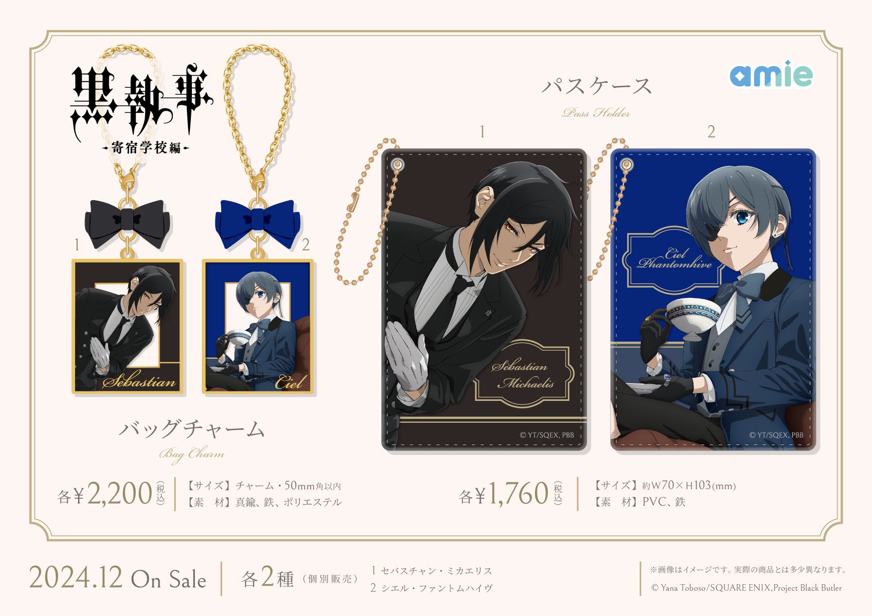 フィギュア&ホビー通販大手の「あみあみ」を運営する大網株式会社(本社・東京都文京区)は、自社が展開するグッズブランド「amie(アミィ)」からTVアニメ『黒執事 -寄宿学校編-』のグッズを、発売いたします。