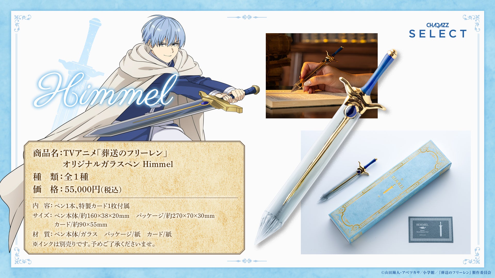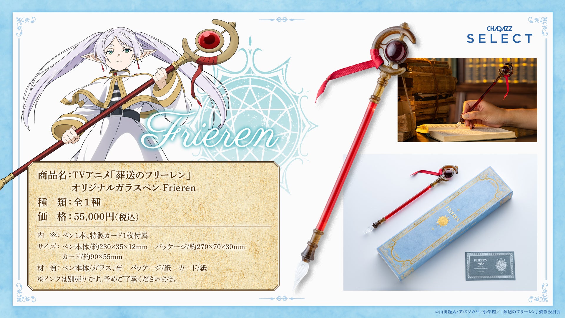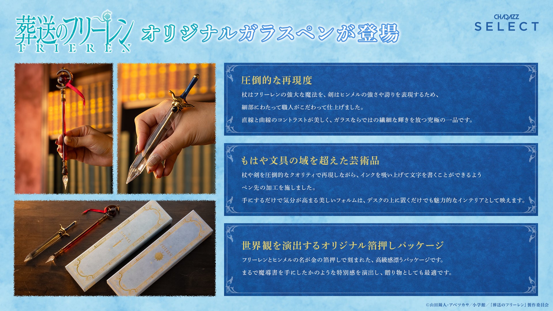 こだわりぬいたキャラクターグッズを制作・販売する「CHARAZZ SELECT」(運営:株式会社HIKE)は、TVアニメ『葬送のフリーレン』のオリジナルガラスペンを発売致します。主人公・フリーレンの杖と勇者・ヒンメルの剣を”ガラス”で再現した職人手作りのオリジナルガラスペンは、圧倒的な再現クオリティでありながら快適な書き心地を兼ね備えています。数量限定・先着受注販売となりますので、この機会をお見逃しなく。