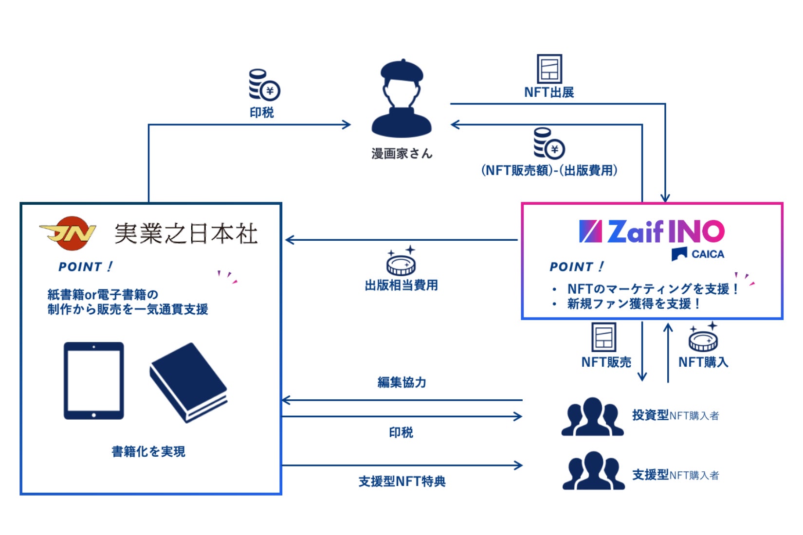 このプロジェクトでは、実業之日本社とZaif INOが協力し、漫画家さんの創作活動を全面的にサポートします。Zaif INOがプロモーションや資金配分、NFT購入者とのコミュニケーションを担当することで、漫画家さんが作品制作に専念できる環境を整え、プロジェクト全体の成功を支えます。