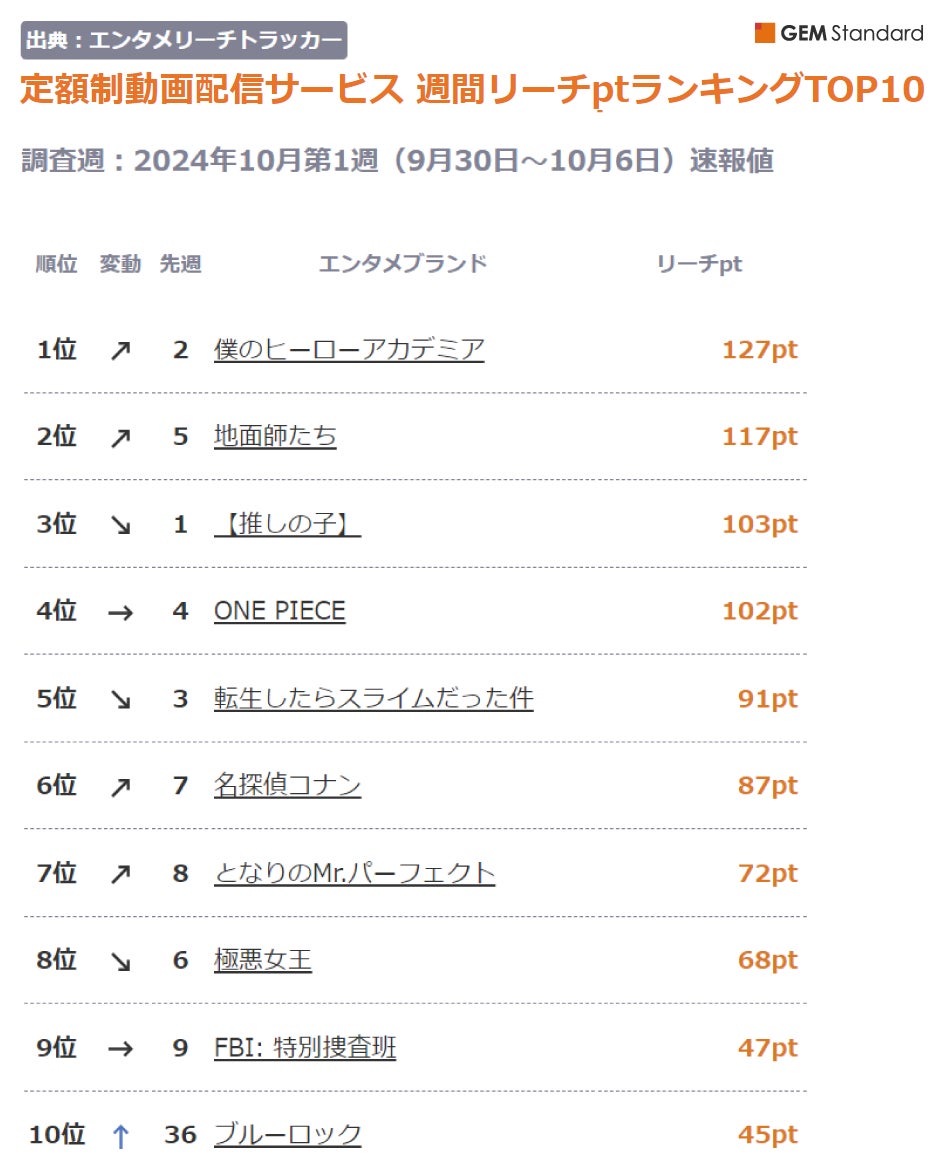 エンタテイメント業界に向けたデータ×デジタルマーケティングサービスを提供するGEM Partners株式会社(ジェムパートナーズ、所在地:東京都港区、代表取締役:梅津文)は10月10日、複数の定額制動画配信サービスを横断集計した2024年10月第1週(9月30日~10月6日)速報値のエンタメブランド別(※1)の週間リーチptランキングTOP10を発表します。