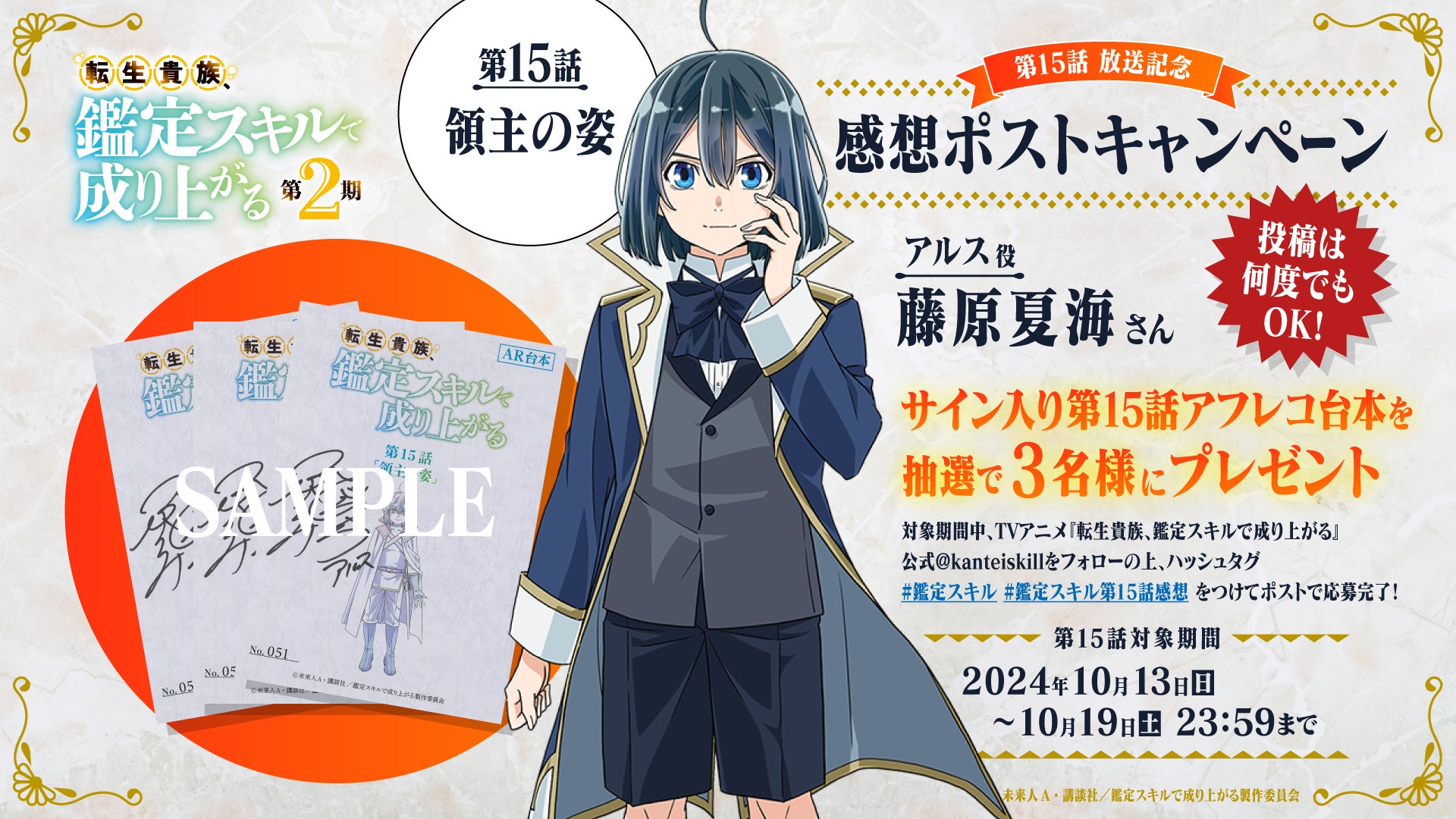 TVアニメ『転生貴族、鑑定スキルで成り上がる 第2期』第15話(第2期3話目)放送を記念して、アルス・ローベント役 藤原夏海さんのサイン入り第15話台本を、3名様にプレゼントいたします。