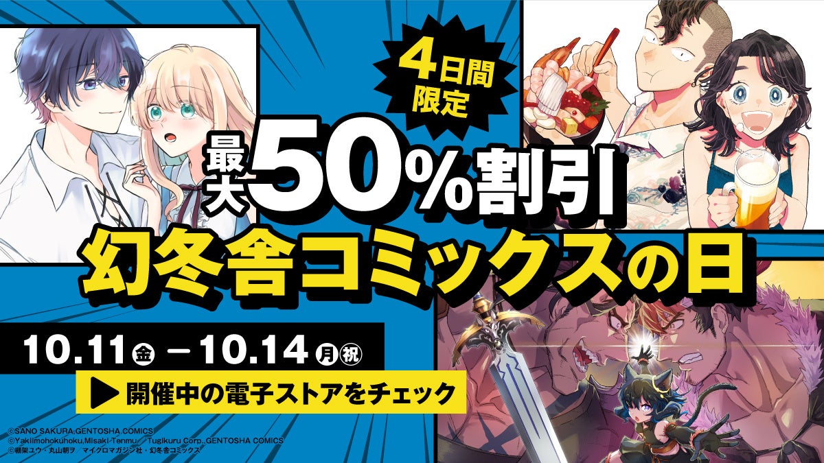 株式会社幻冬舎コミックス(本社:東京都渋谷区、代表取締役社長:石原正康)は、今年も電子書籍キャンペーンとして、「幻冬舎コミックスの日」を実施いたします。実施期間は10月11日(金)から10月14日(月・祝)までの4日間。各電子書店で、3,800冊以上のコミックスや小説が最大50%OFFで購入できます。