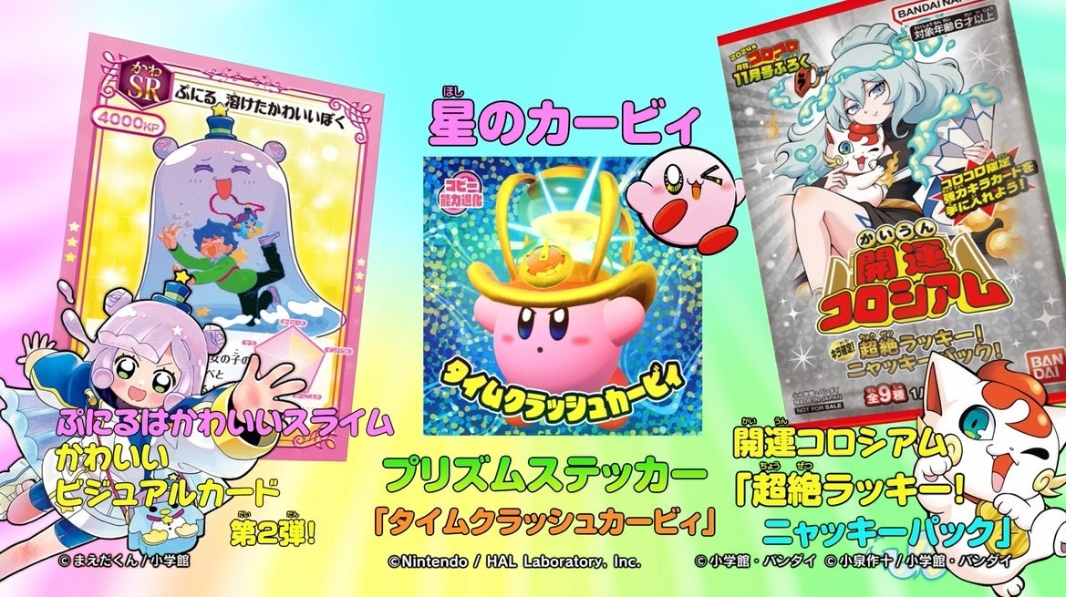 さらに! TVアニメでも話題の『ぷにるはかわいいスライム』からはビジュアルカード「溶けたかわいいぼく」や、「星のカービィ」の12号連続プリズムステッカー「タイムクラッシュカービィ」、「開運コロシアム」のカードパック「超絶ラッキー! 開運コロシアムパック」と特別ポスターがふろく!!