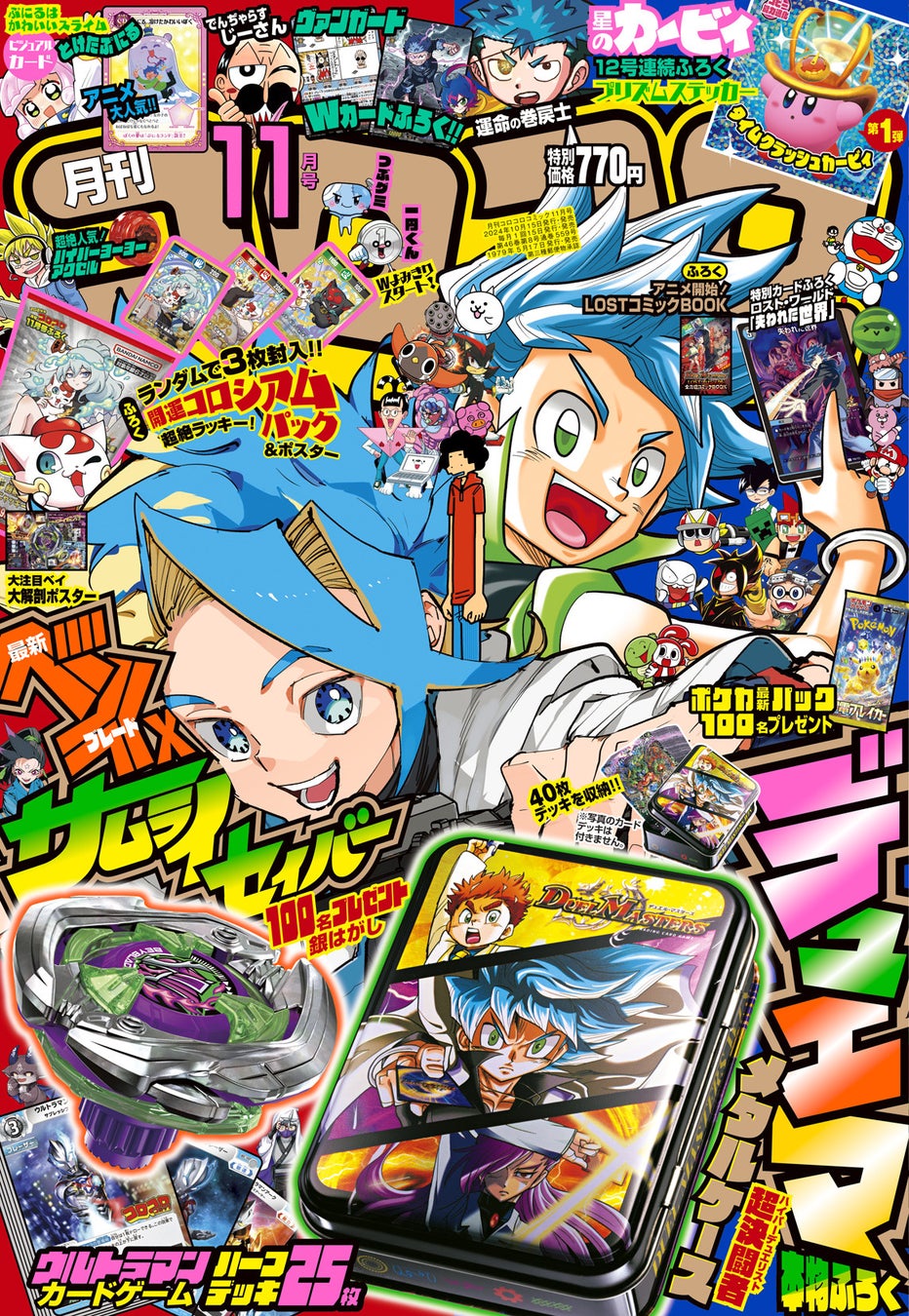 11月号は、デュエル・マスターズのデッキをまるごと収納できる「超決闘者(ハイパーデュエリスト)メタルケース」がふろく! さらに、『Duel Masters LOST』金林洋先生がイラストを描く特別カードふろく「失われた世界(ロスト・ワールド)」、アニメ開始記念別冊「Duel Masters LOSTコミックBOOK」、デュエル・マスターズのデッキ「ドリーム英雄譚(サーガ)デッキ モモキングの書」「ナイトメア黙示録(サーガ)デッキ バロムの章」の合計200名プレゼント銀はがし……など、デュエマ尽くし!!