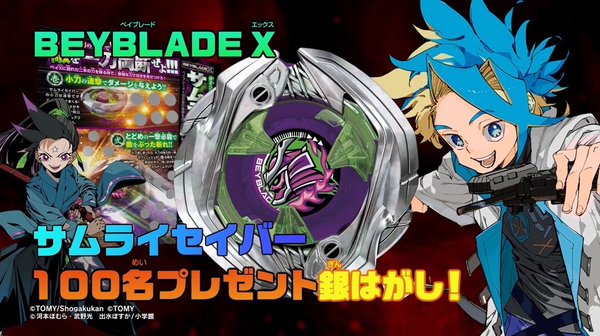 「BEYBLADE X」からは、大注目ベイ「サムライセイバー」の100名プレゼント銀はがし! 衝撃の新ベイ情報も満載、ベイブレーダー必読!