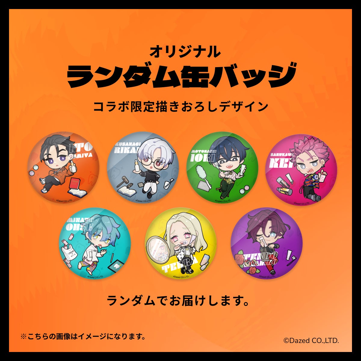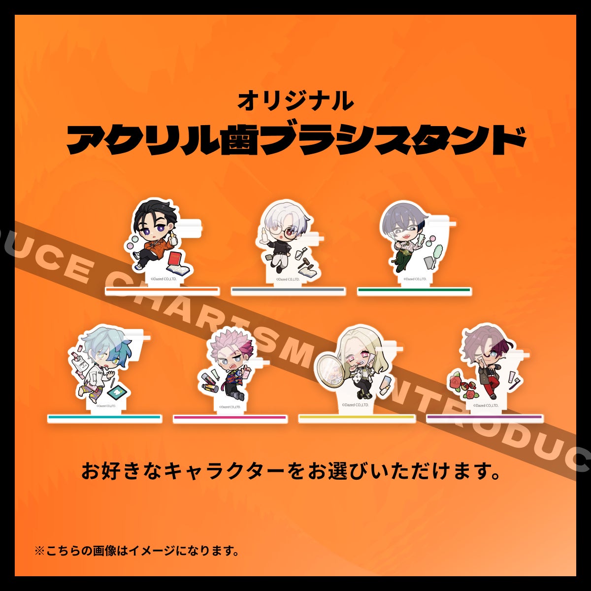 キャラを選べるアクリル歯ブラシスタンド、缶ケース、缶バッジに加え、コンプリートセット限定で描きおろしトレカとトレカデコシールが特典に。
