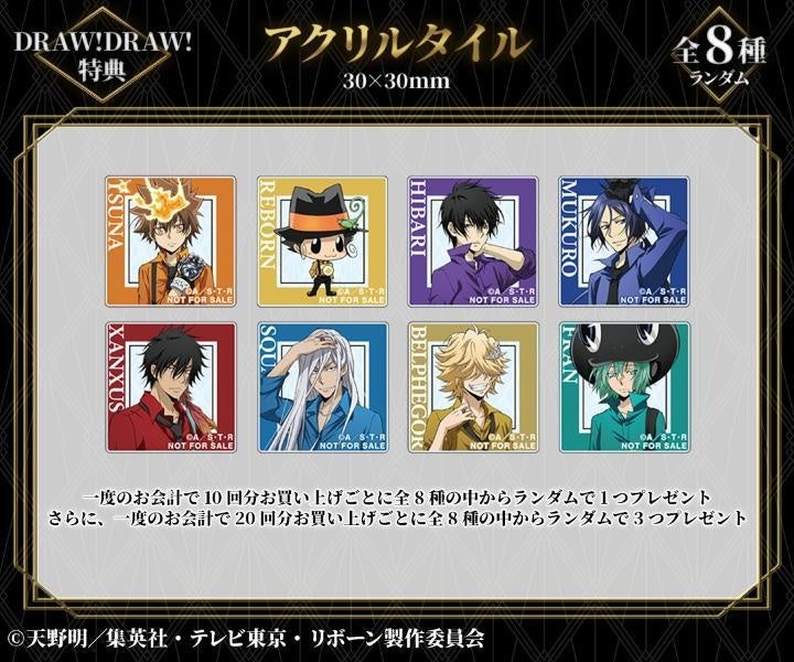 一度のお会計で10回分ご購入ごとに特典アクリルタイル(全8種)の中からランダムで1つ、20回分ご購入ごとにランダムで3つプレゼント!
