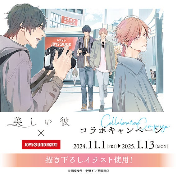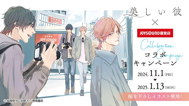 株式会社エクシングの子会社で、全国にカラオケ店舗を展開する株式会社スタンダード(本社:東京都港区、代表取締役社長:米田洋一)は、2024年11月1日(金)から2025年1月13日(月)までの期間中、「『美しい彼(作:凪良ゆう先生)』×JOYSOUND直営店コラボキャンペーン」と題し、JOYSOUND池袋西口公園前店(東京)・JOYSOUND心斎橋店(大阪)の2店舗にカラオケコラボルームをオープン!また、JOYSOUND直営店30店舗にて、オリジナルポストカード付きコラボドリンクを展開します。さらに、一部店舗およびオンラインストアにて、オリジナルグッズの販売も行います。当コラボでは、コミカライズを手がける北野 仁先生の描き下ろしイラストを使用いたします!