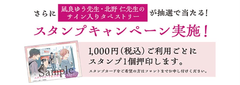 また、コラボドリンクご注文でお渡しするスタンプカードに、カラオケご利用金額1,000 円(税込)ごとにもらえるスタンプを5つ集めて応募すると、凪良ゆう先生、北野 仁先生のサイン入りタペストリーが抽選で5名様に当たる、スタンプキャンペーンも実施します!