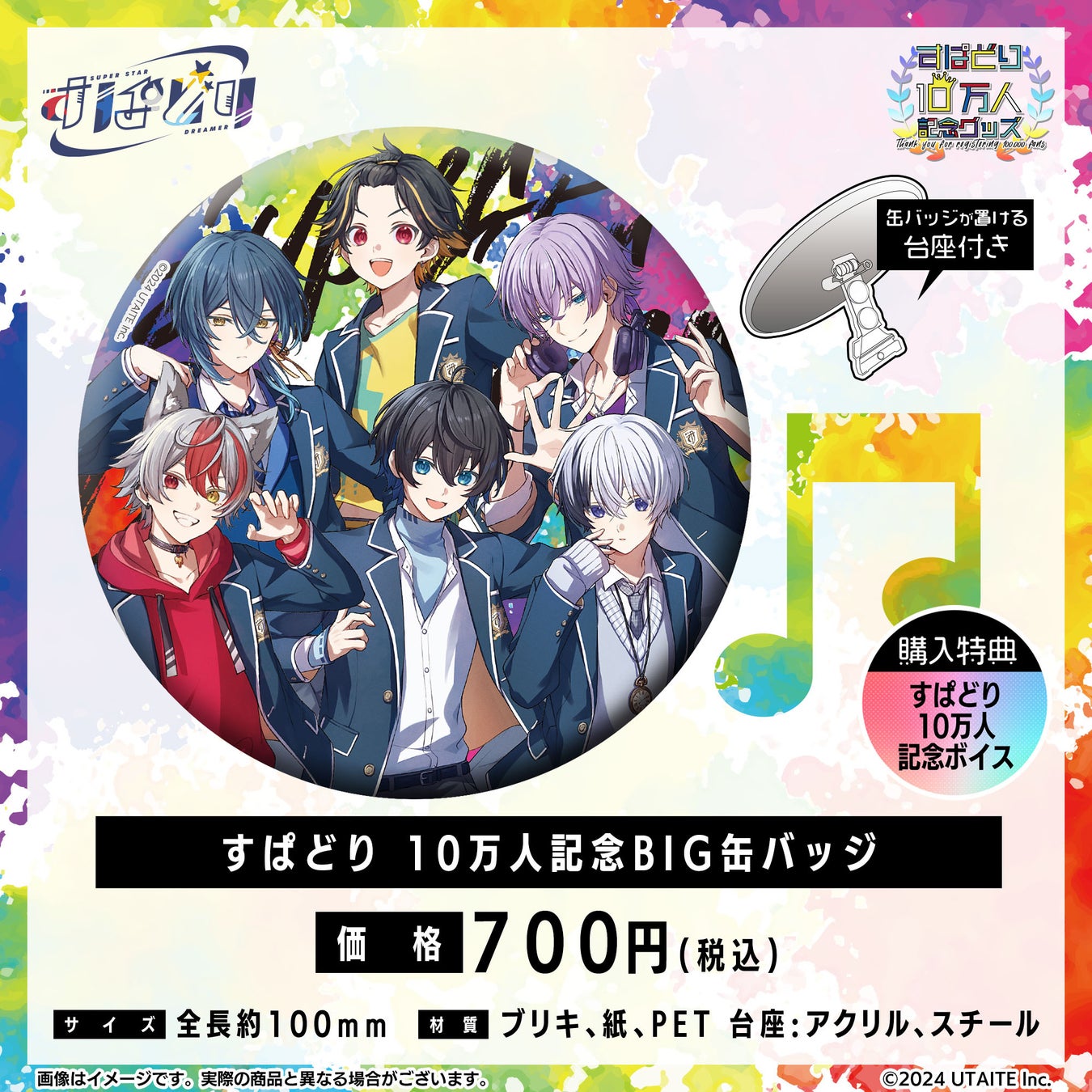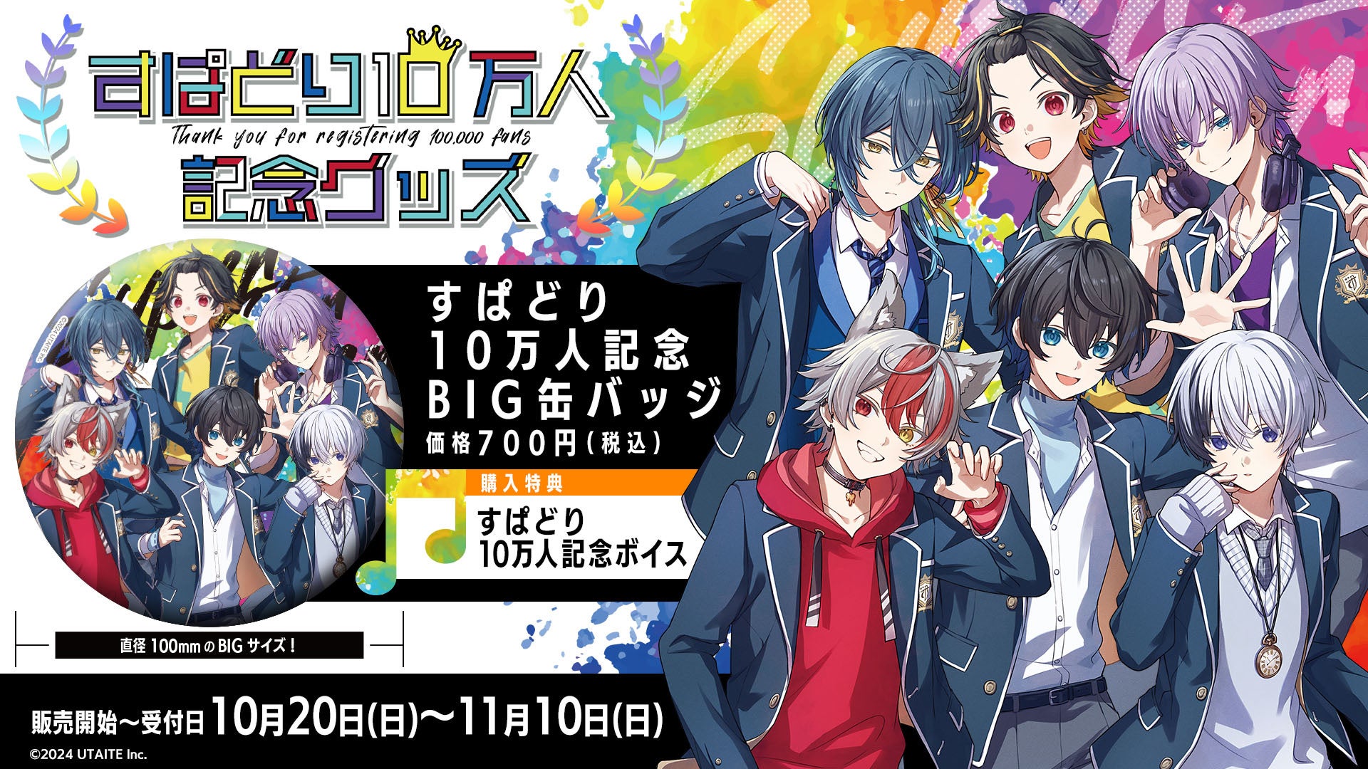 2.5次元IP開発、運営を行う株式会社ウタイテ(本社:東京都新宿区、代表取締役:倉田将志)は2024年10月20日(日)20時より、UTAITEオフィシャルストアにて「すぱどり10万人記念グッズ」の受注販売を開始することをお知らせいたします。
