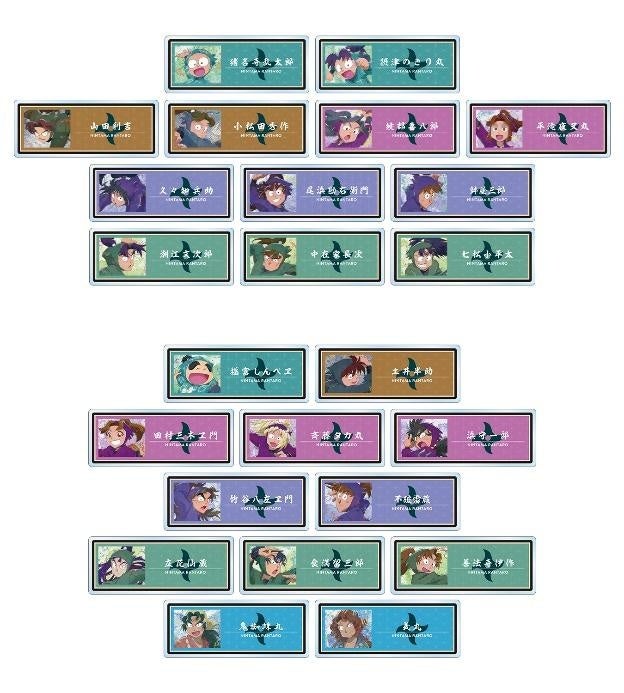 猪名寺乱太郎、摂津のきり丸、福富しんべヱ、土井半助、山田利吉、小松田秀作、綾部喜八郎、平滝夜叉丸、田村三木ヱ門、斉藤タカ丸、浜守一郎、久々知兵助、尾浜勘右衛門、竹谷八左ヱ門、鉢屋三郎、不破雷蔵、潮江文次郎、立花仙蔵、中在家長次、七松小平太、食満留三郎、善法寺伊作、鬼蜘蛛丸、義丸のイラストを新たなタッチで魅力的に表現し、アクリルネームプレートに仕上げました。