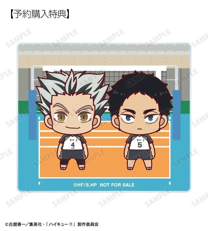 及川 徹、岩泉 一、黒尾鉄朗、孤爪研磨、牛島若利、天童 覚、木兎光太郎、赤葦京治、宮 侑、宮 治、星海光来、昼神幸郎がちょこんと立っているちびキャラを新たに描き起こし、アクリルカードに仕上げました。