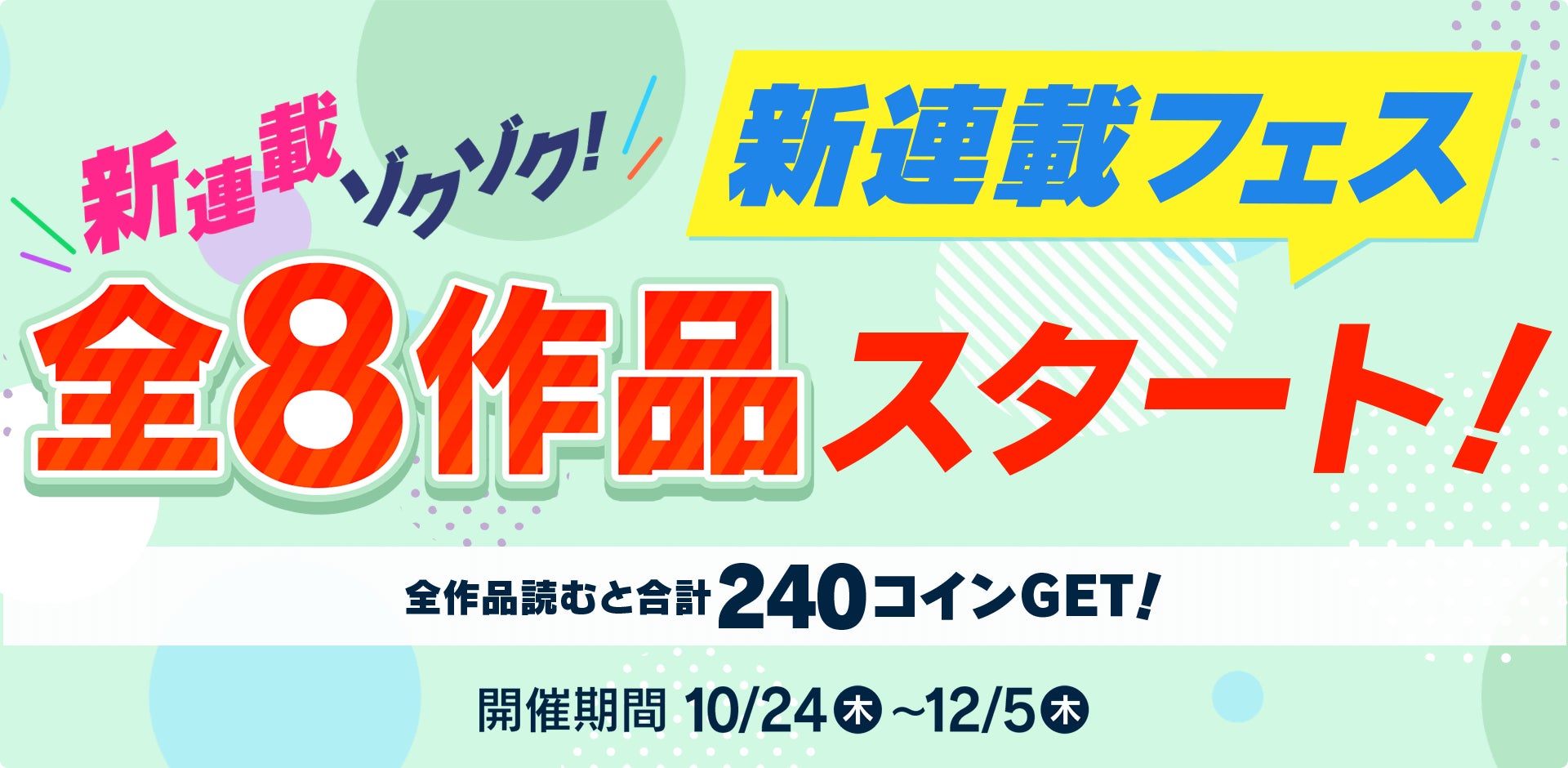 期間中に新連載の1話を読むと30 コイン、8作品全て読めば最大で合計240コインを獲得できます。